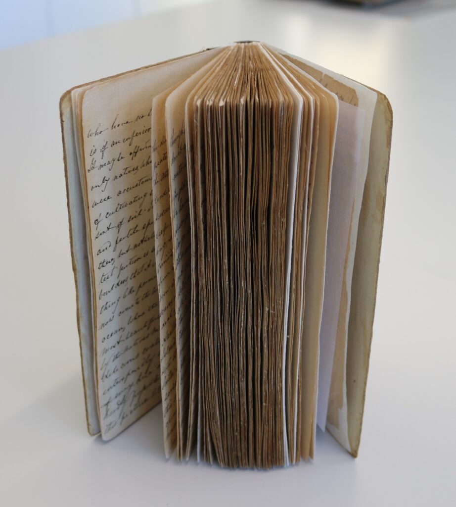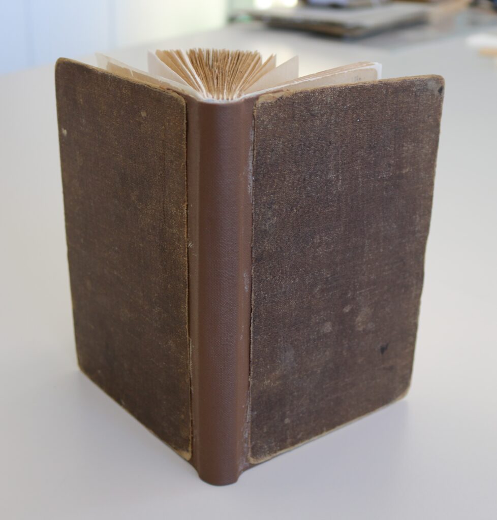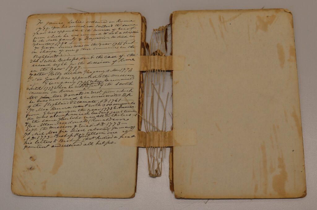 The photographs below of the finished article illustrate the success of the work done to restore the volume. As a result we were able to feature the item in our Cianalas ‘s Dòchas | Homesickness and Hope emigration exhibition. We have also been able to digitise it. The conservation treatment was funded by donations from visitors to both our museums. Thanks to their generosity, we are able to make this important artefact accessible now and for future generations.