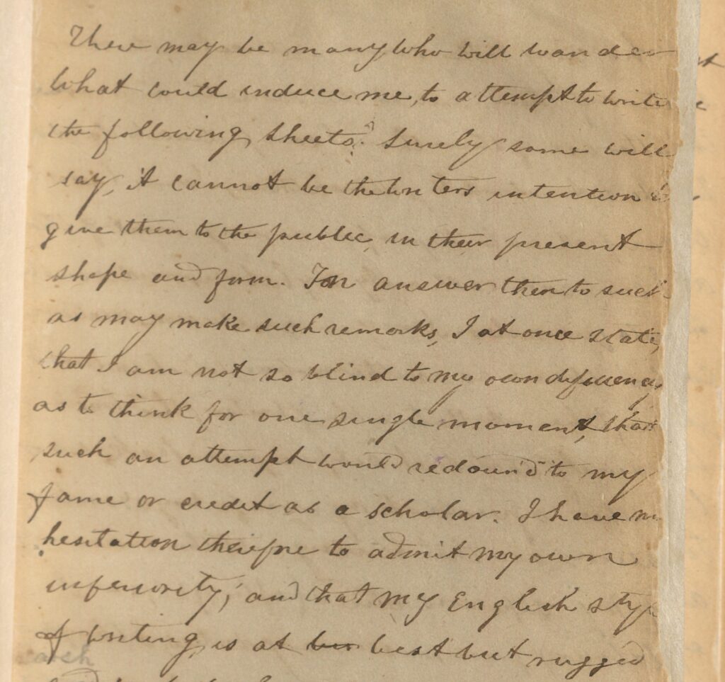 ‘There may be many who will wonder what could induce me to attempt to write the following sheets? Surely some will say, it cannot be the writer’s intention to give them to the public in their present shape and form. For answer then to such as may make such remarks, I at once state that I am not so blind to my own deficiency as to think for one single moment that such an attempt would redound to my fame or credit as a scholar. I have no hesitation therefore to admit my own inferiority; and that my English style of writing is at best but rugged and unpolished and in consequence unfit for publication. I disclaim then such intention and tell candidly that my only motive in writing the following memories is to preserve a few of the traditions of my native isle. Perhaps some may come after who may take some interest in the narration of them, and at the same time make better use of them than I can pretend to do. As I do not intend to publish them, I am less careful as to the proper arrangement of them… l may in conclusion mention that there was another motive, which induced me, to be at the trouble of writing these traditions, namely that such self imposed task, was rather agreeable to my own feelings and inclination: and that having with the consent of my superiors retired (after 42 years labour) from missionary duties, I thought I might employ the leasure [sic] I now enjoy in committing such events to paper.